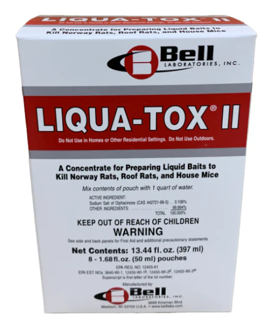 LIQUA-TOX II is a liquid concentrate containing the active ingredient, Diphacinone, that kills rats and mice. It contains 0.106 percent Sodium Diphacinone which mixes easily in a quart of water to yield a finished bait with 0.005 percent Diphacinone.