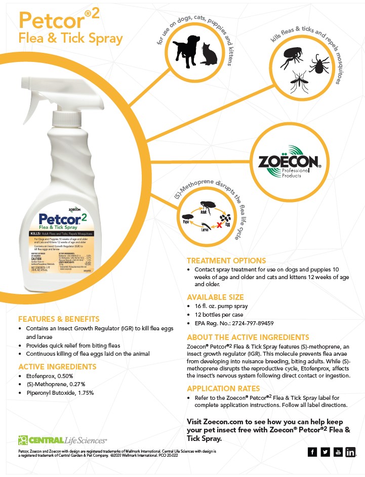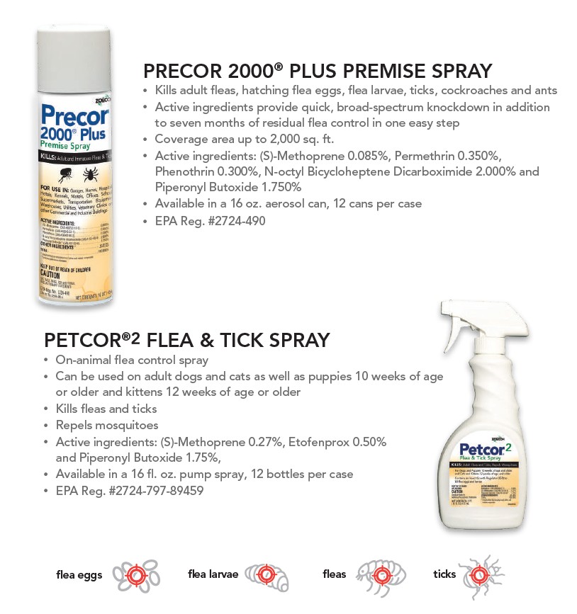 The mobility of dogs and cats makes it difficult to treat all potential areas of flea infestation. So, it’s important to consider a flea control formulation that goes where they do – especially one that targets pre-adult fleas, the source of reinfestations. Petcor Flea Spray contains Precor® IGR, an Insect Growth Regulator that targets flea eggs on the animal by sterilizing them.